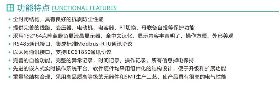 2.提供完善的線路、變壓器、電動機、電容器、PT切換、母聯(lián)備自投等保護(hù)功能