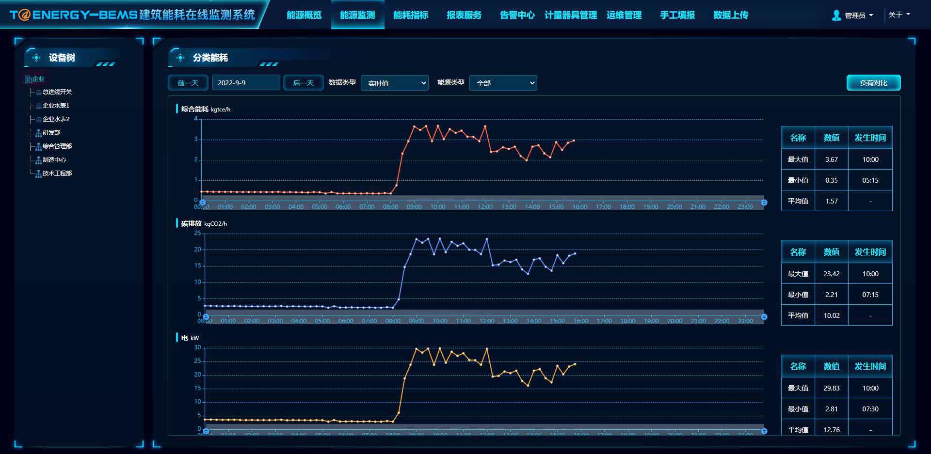 展示建筑體的分類分項能耗曲線圖、最值的數據和發生時間、以及負荷對比。