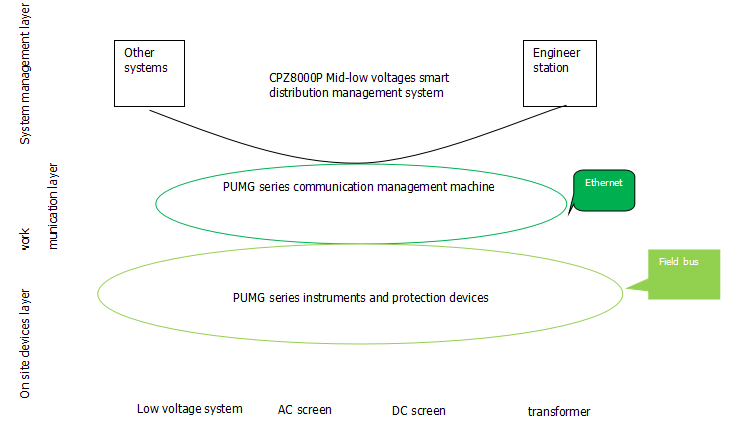 CPZ8000P mid- low voltagesmart power distribution management system adopts hierarchical and distributed structure design, The whole system could be divided into three layers accord to the interval unit and modular design: system management layer, network communication layer and on site devices layer.