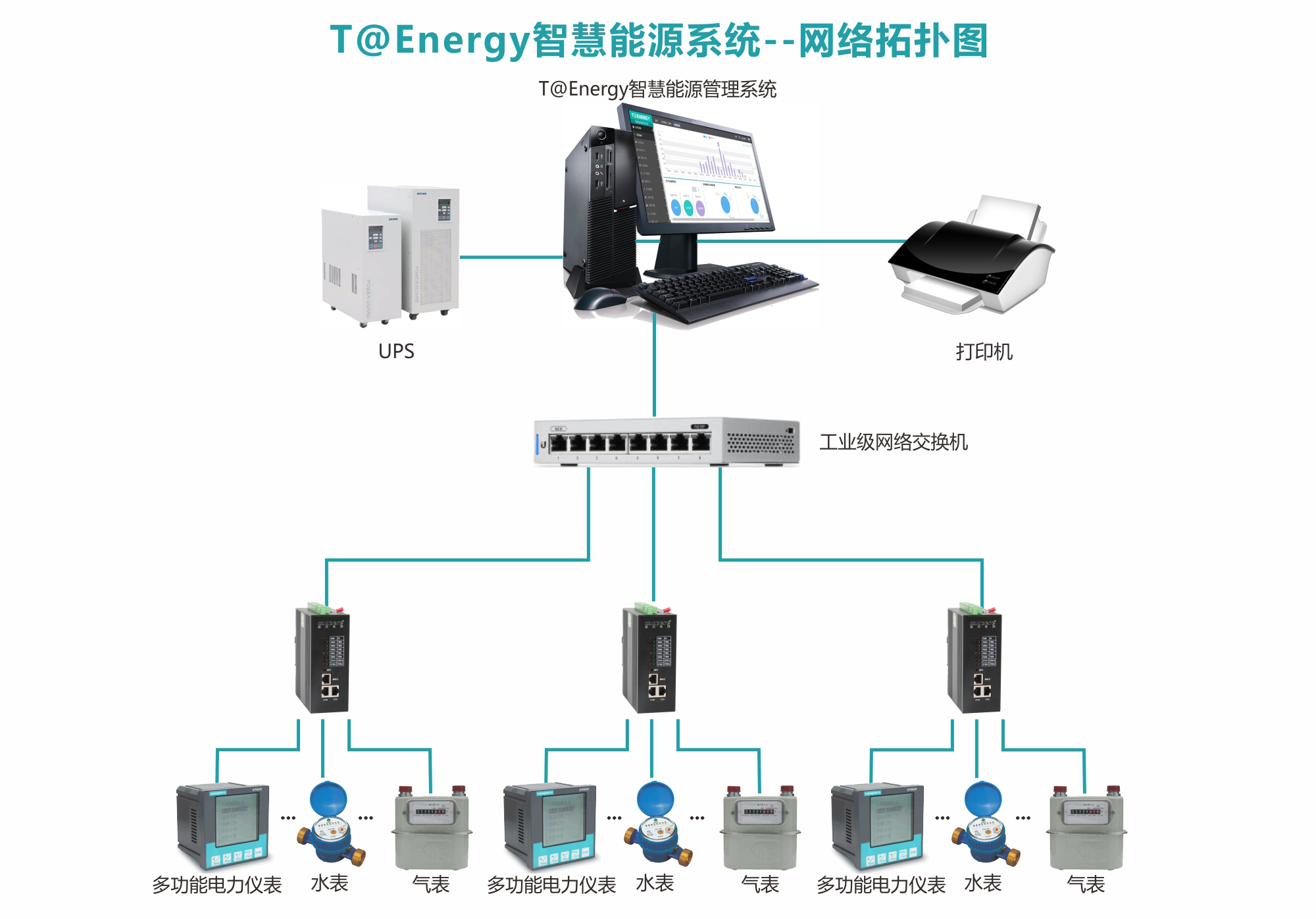 能效管理層是人機交互的窗口,也是T@Energy 能源管理系統的重要組成部分,該層級主要由數據顯示氣、監控主機、打印機、UPS不間斷電源組成,可實時顯示和處理設備采集的數據和測控信息號。