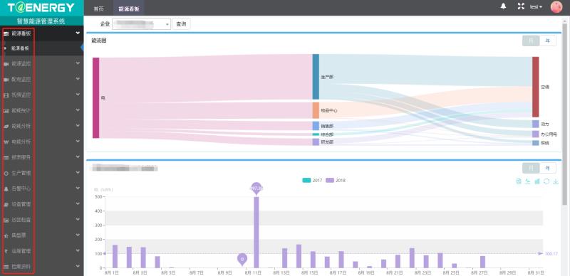 1. 能源看板:能源看板是能源管理系統提供的一項系統概覽功能,以能流圖和圖表的形式呈現酒店的整體能耗、各分類分項能耗及能耗趨勢等信息。能源看板可以靈活配置,不同的用戶可以根據自身的實際情況自由選擇呈現形式以及數據展現的周期。