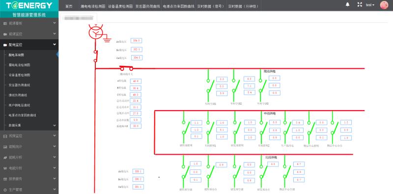 3. 配電監控:配電監控功能以能源管理系統的計量儀表及數據采集、上報的能耗數據為基礎,實現對配電系統圖、漏電電流檢測圖等圖紙中直觀展現各類能耗設備的運行參數,對于觀察全部配電設備的基本運行參數極其方便。