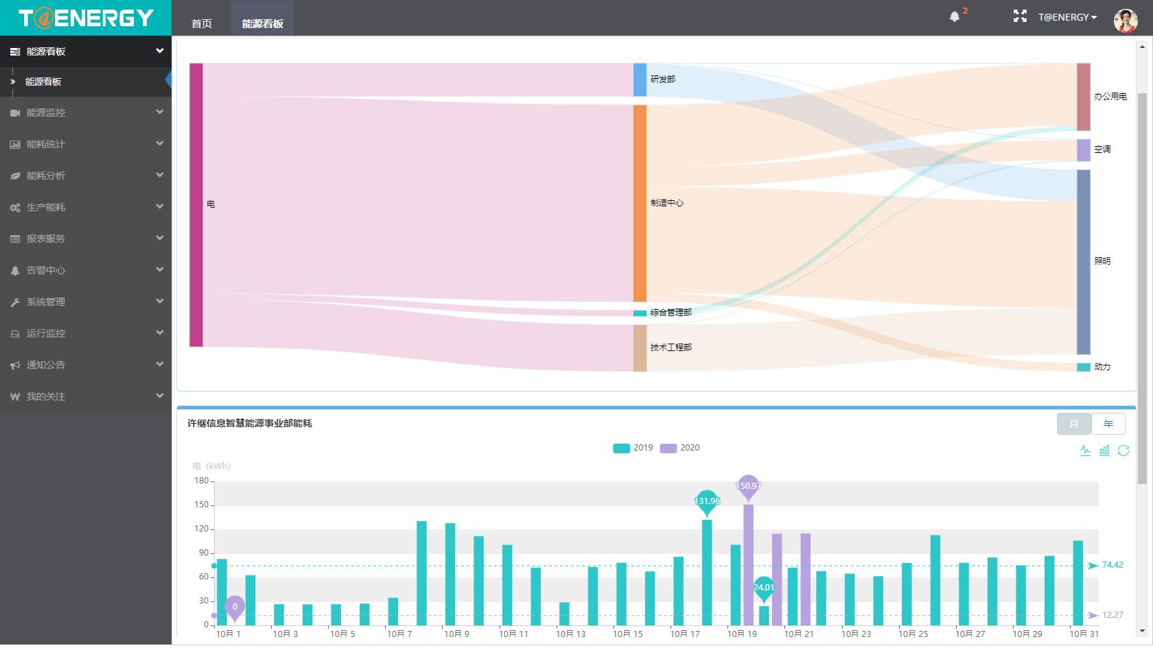 T@Energy智慧能源管理系統(tǒng)采用先進(jìn)的智能化集成技術(shù),基于B/S架構(gòu)的能源管理平臺,該平臺采集各能耗監(jiān)測點(diǎn)(變配電、照明、空調(diào)、電梯、給排水、熱水機(jī)組和重點(diǎn)設(shè)備)的能耗和運(yùn)行信息,形成能耗的分類、分項(xiàng)、分區(qū)域統(tǒng)計(jì)分析,對能源的統(tǒng)一調(diào)度、優(yōu)化能源介質(zhì)平衡、減少煤氣放散、提高環(huán)保質(zhì)量、降低企業(yè)綜合能耗和提高勞動(dòng)生產(chǎn)率有重要作用,幫助客戶更有效的使用能源,從而實(shí)現(xiàn)“節(jié)能管理、綠色能效”。
