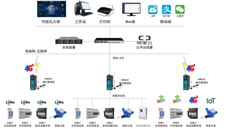 現(xiàn)場(chǎng)采用RS485、以太網(wǎng)GPRS、4G、NB-ot.lora、 Zigbeeifi等傳輸方式,將區(qū)域內(nèi)的電力采集模塊連接至相對(duì)的通訊管理機(jī);各通訊管理機(jī)通過(guò)用戶局域網(wǎng)連接至中央服務(wù)器。