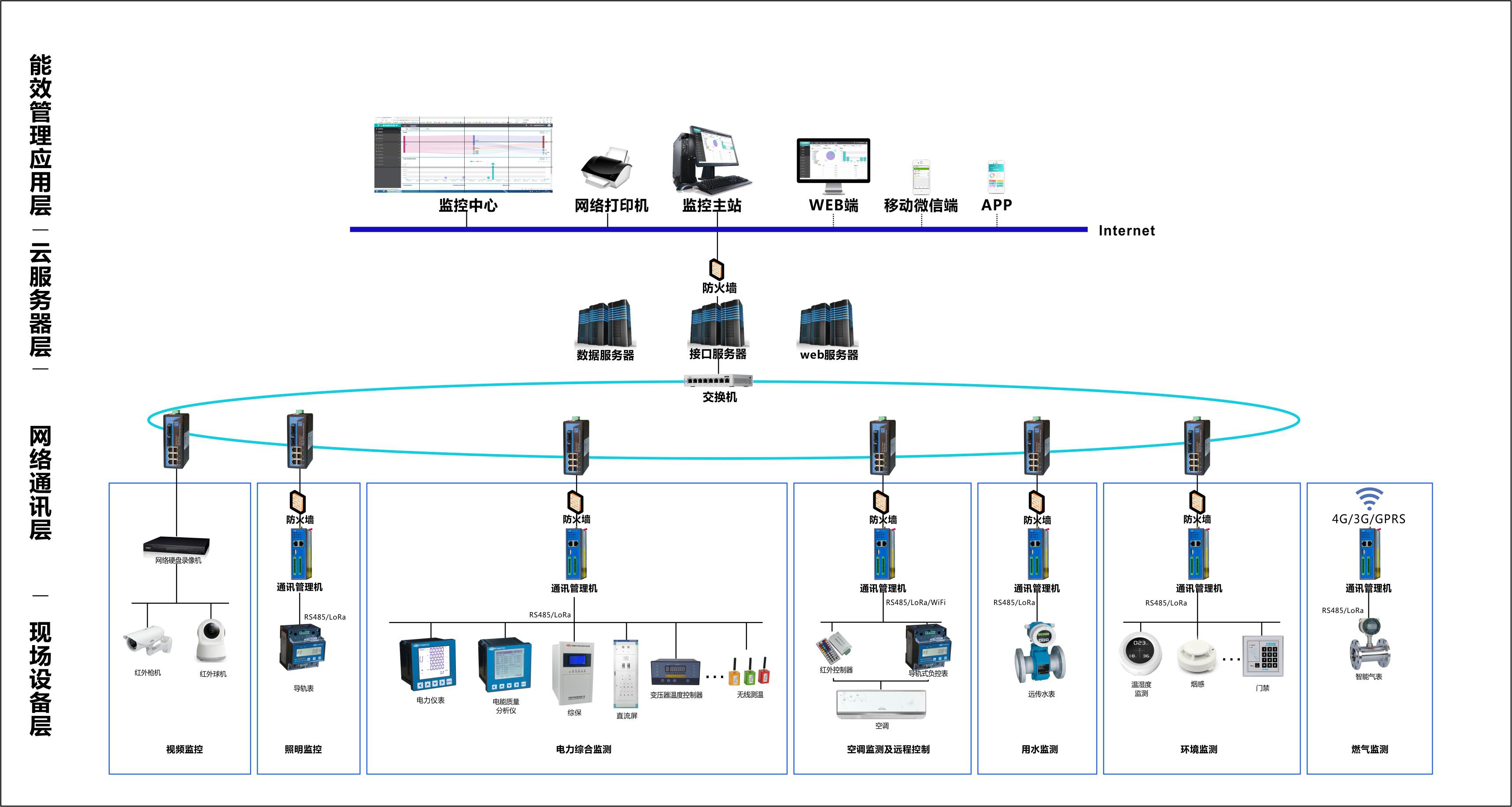 現場設備層負責電、水、氣、暖和環境參數的采集與上傳。現場設備層由多功能電力儀表、多功能電能表、智能水表、智能氣表、溫濕度傳感器等采集裝置組成。