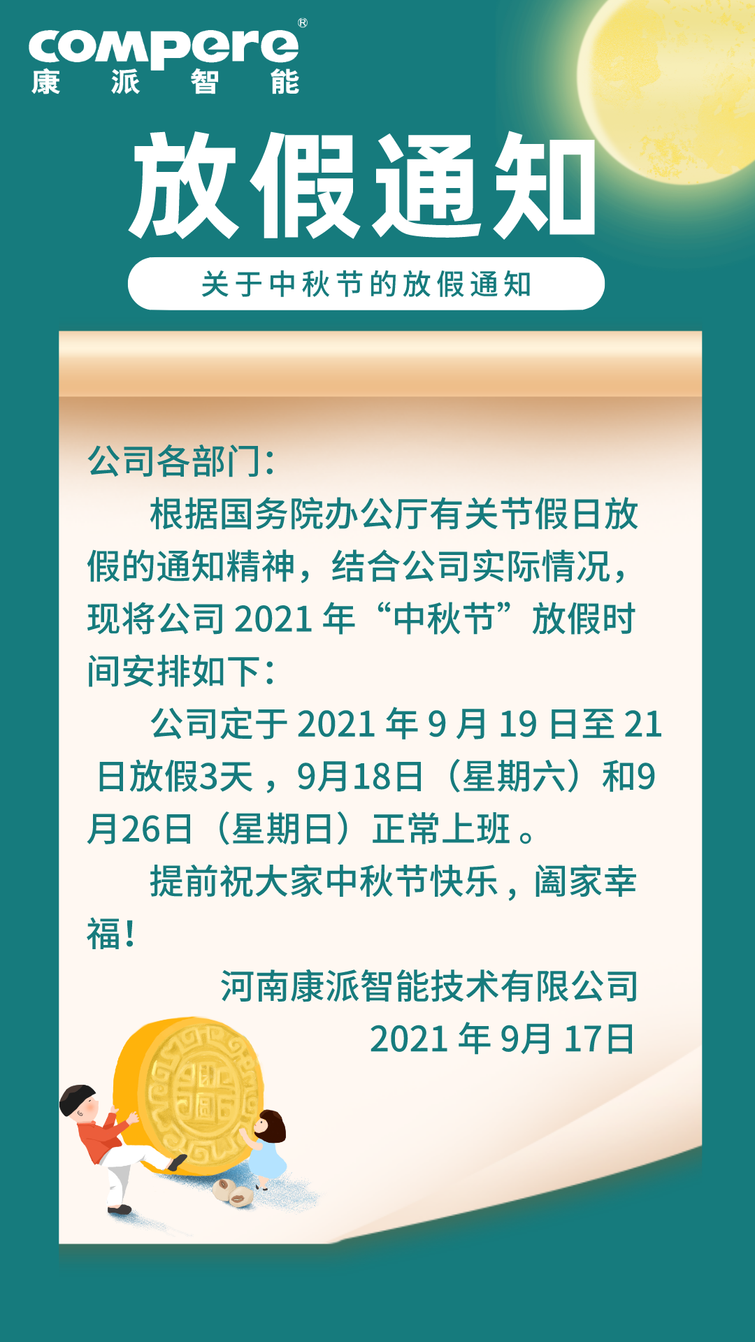 2021康派智能中秋節(jié)放假通知