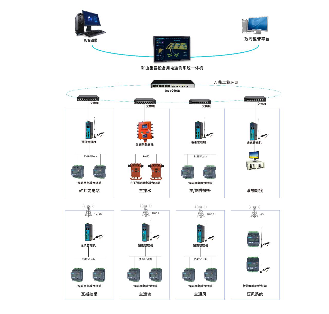·網絡層:以礦山內部通訊管理機及相關網絡線路組成,通訊管理機用于末端計量表計和第三方監測系統內數據的采集、存儲、協議轉換并上傳至“管理一體機”或上級平臺 。根據監測點位的數量和位置不同,可任意擴展通訊管理機的數量。