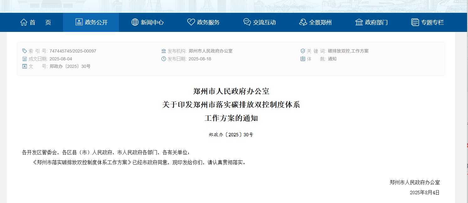 近日,鄭州市人民政府辦公室印發鄭州市落實碳排放雙控制度體系工作方案的通知。