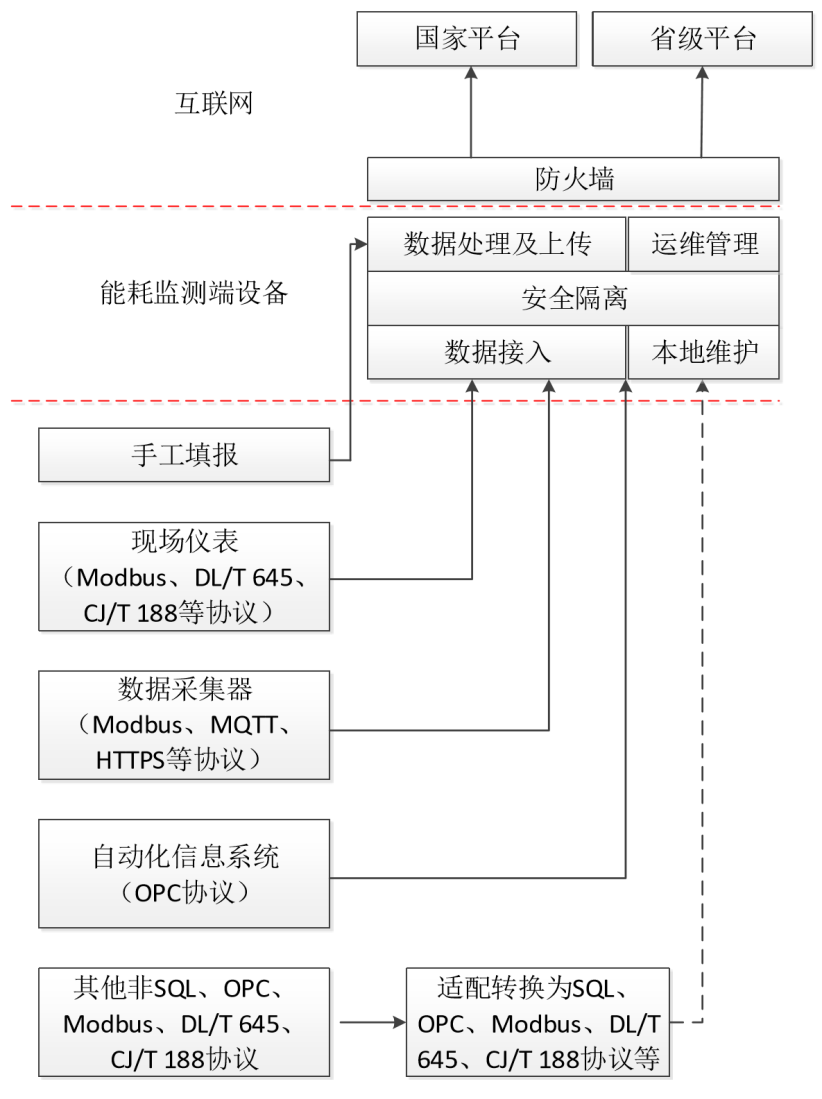 端設備支持SQL、OPC、MODBUS、DL/T 645、CJ/T188協(xié)議,能耗在線監(jiān)測端設備對采集到的數(shù)據(jù)進行匯總,驗證、篩選、整理打包后,采用“CA認證+HTTPS協(xié)議+VPN專線”方式多重加密將數(shù)據(jù)傳輸至省級平臺。